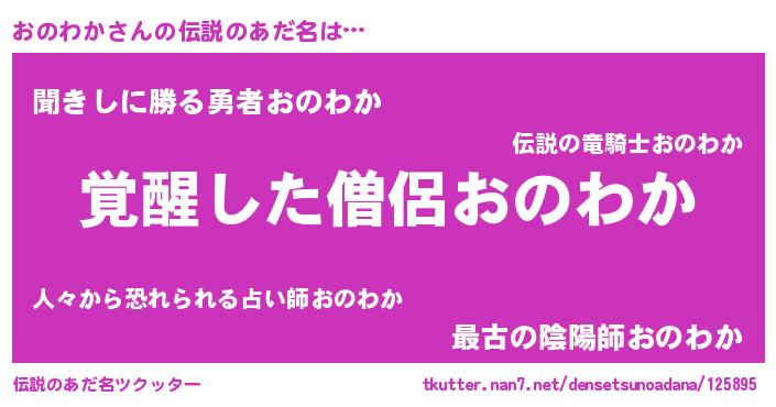 | 男性向けラノベタイトル風あだ名 | 『おのわかの嫁は女の子じゃないと思った?』 |