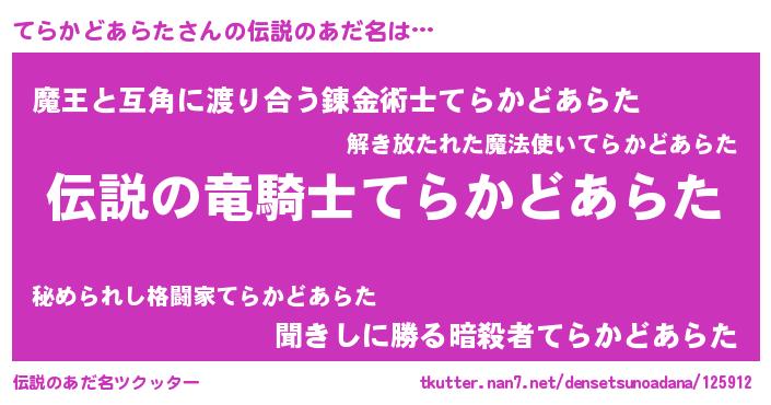 | 男性向けラノベタイトル風あだ名 | 『テラカドアラタスレイヤー』 |