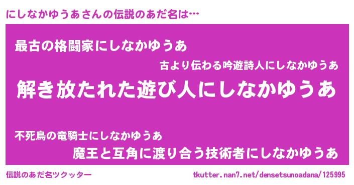 | 意味不明あだ名 | 『住所不定無職にしなかゆうあ(95歳)』 |