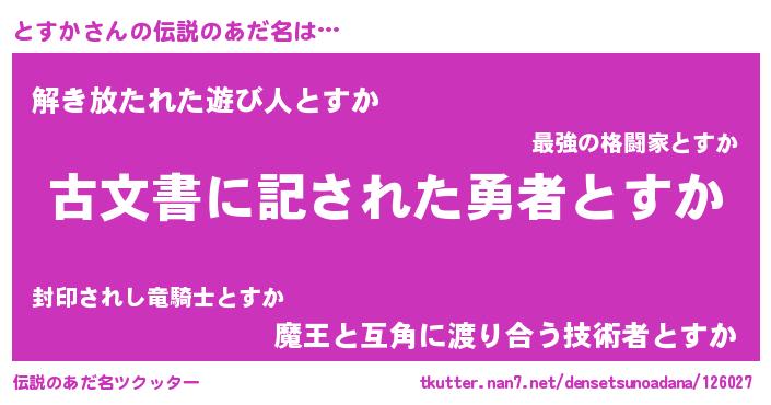 | 胡散臭い通販商品みたいなあだ名 | 『あなたにだけ特別に提供する世界で10本だけ現存している希少なブランデー…その名も「とすか」』 |
