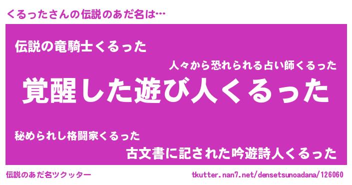 | 男性向けラノベタイトル風あだ名 | 『くるったの嫁は女の子じゃないと思った?』 |