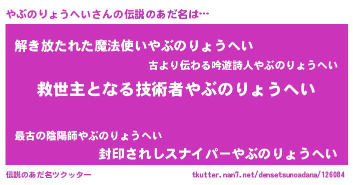 | 胡散臭い通販商品みたいなあだ名 | 『あなたにだけ特別に提供する100年もののヴィンテージワイン…その名も「やぶのりょうへい」』 |