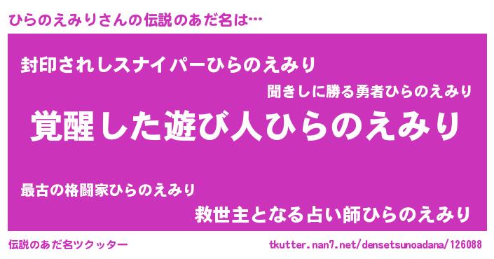 | ヒーロー風カッコイイあだ名 | 『天弓騎士ヒラ』『スーパーヒラノエミリ』 |