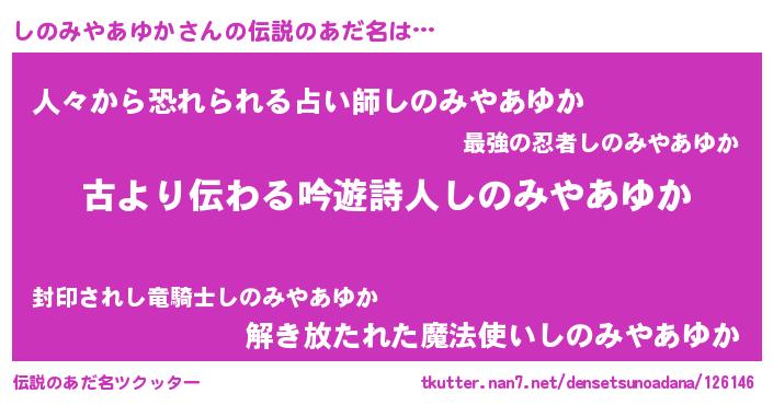 | ヘコむあだ名 | 『しのみやあゆか(笑)』『しのっぺ』 |