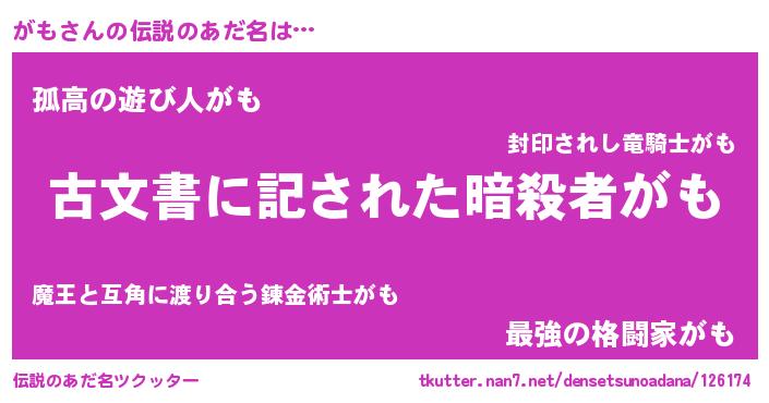 | 胡散臭い通販商品みたいなあだ名 | 『あなたにだけ特別に提供する限定10本のレアな日本酒…その名も「がも」』 |
