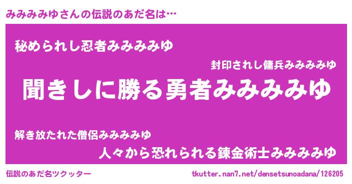 | 男性向けラノベタイトル風あだ名 | 『みみみみゆという概念が存在しない退屈な世界 』 |