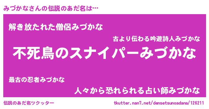 | ヒーロー風カッコイイあだ名 | 『スーパーミヅカナ』『銀牙騎士ミヅ』 |
