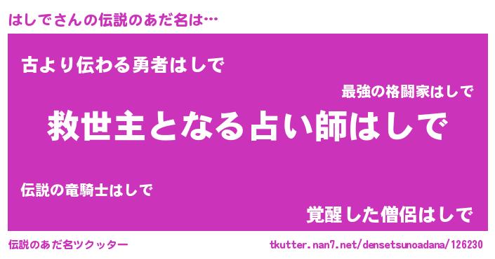 | ヒーロー風カッコイイあだ名 | 『慈愛の使者はしで』『ネオハシデ』 |