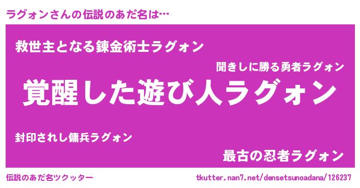 | 女子向けラノベタイトル風あだ名 | 『ラグォン様がみてる』『ラグォン恋絵巻』 |