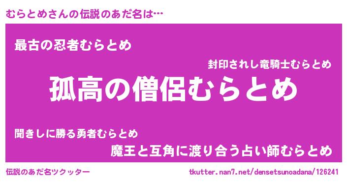 | ヒーロー風カッコイイあだ名 | 『暗黒騎士ムラ』『最強戦士ムラトメ』 |