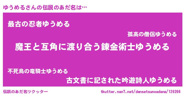 | ヒーロー風カッコイイあだ名 | 『慈愛の使者ゆうめる』『仮面ユウダー』 |
