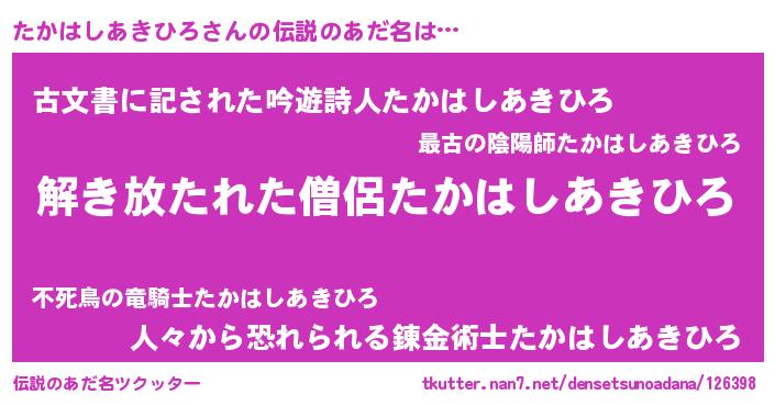 | 女子向けラノベタイトル風あだ名 | 『たかはしあきひろの卵を拾いまして』 |