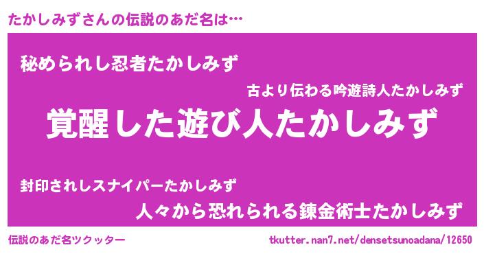 | 男性向けラノベタイトル風あだ名 | 『たかしみずの嫁は女の子じゃないと思った?』 |
