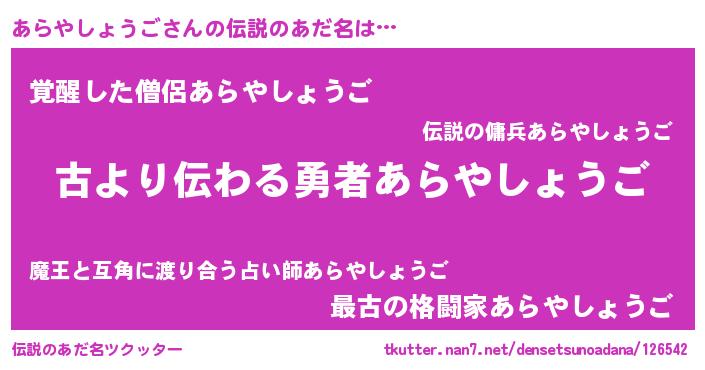 | 男性向けラノベタイトル風あだ名 | 『この素晴らしい世界にあらやしょうごを!』 |