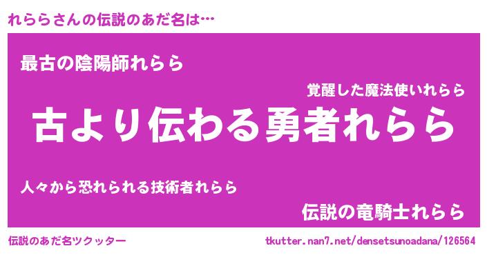 | ヘコむあだ名 | 『れらら(遠い目)』『豆乳』『れらお』 |