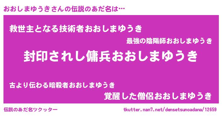 | 男性向けラノベタイトル風あだ名 | 『おおしまゆうきに滅ぼされるだけの簡単なお仕事です』 |