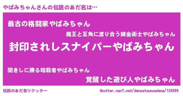 | 男性向けラノベタイトル風あだ名 | 『ヤバミチャンアートオンライン』 |