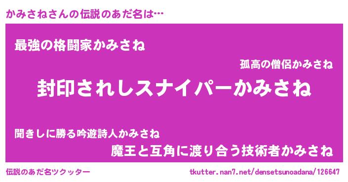 | 男性向けラノベタイトル風あだ名 | 『かみさね~年齢イコール彼女いない歴の魔法使い~』 |