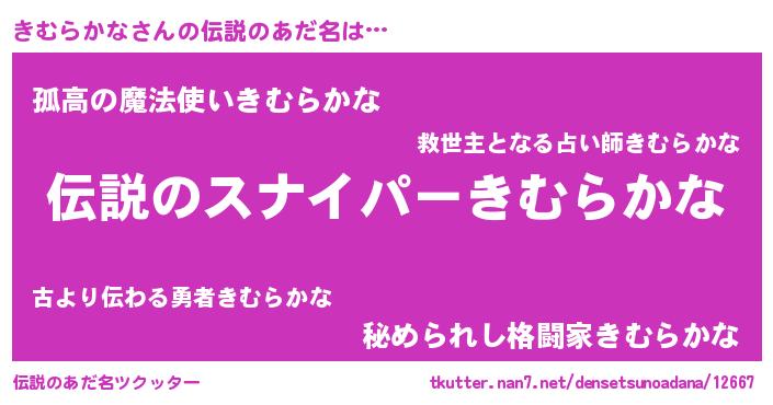 | 男性向けラノベタイトル風あだ名 | 『キムラカナスレイヤー』 |