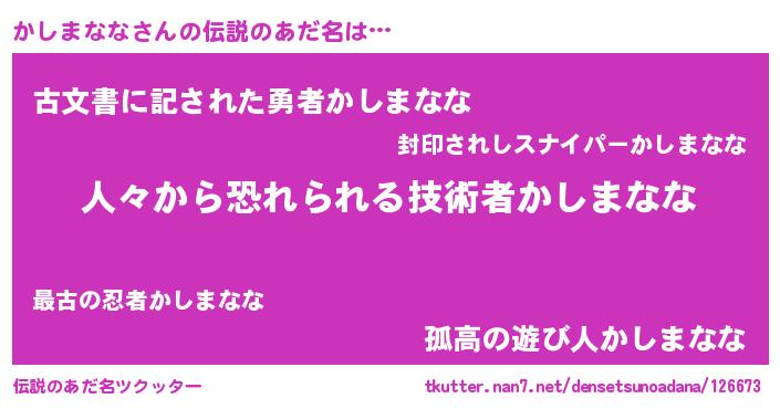 | ヘコむあだ名 | 『かしまなな(小並感)』『かしぷりん』 |