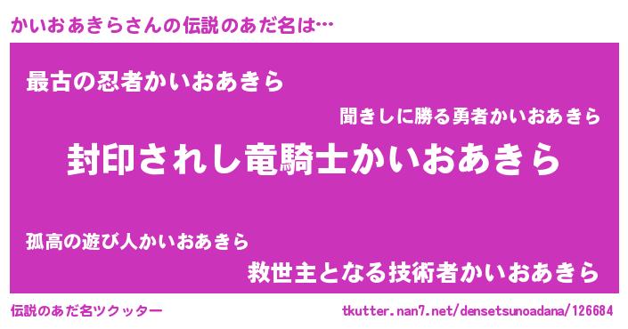 | 男性向けラノベタイトル風あだ名 | 『かいおあきらに滅ぼされるだけの簡単なお仕事です』 |