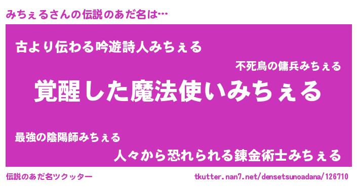 | 男性向けラノベタイトル風あだ名 | 『みちぇるの嫁は女の子じゃないと思った?』 |