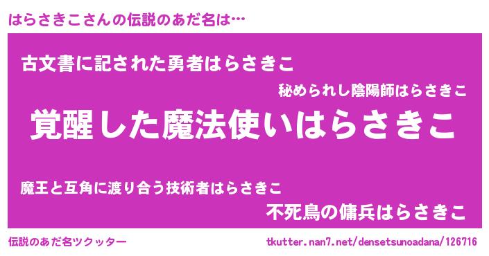 | 男性向けラノベタイトル風あだ名 | 『はらさきこの嫁は女の子じゃないと思った?』 |