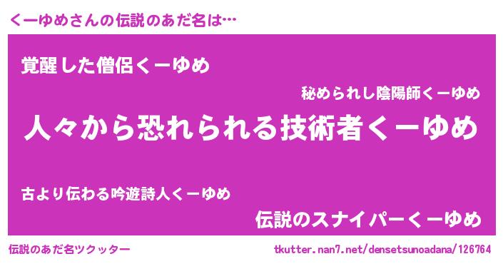 | ヒーロー風カッコイイあだ名 | 『正義の使者くーゆめ』『天弓騎士クー』 |