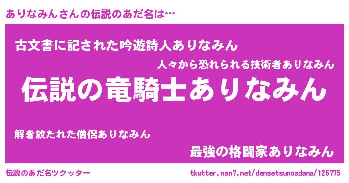 | 胡散臭い通販商品みたいなあだ名 | 『必ず成功するブレスレット…その名も「ありなみん」』 |