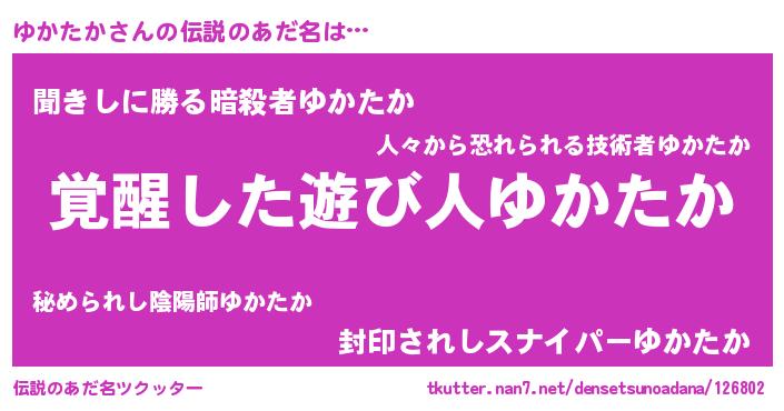 | ヒーロー風カッコイイあだ名 | 『最強戦士ユカタカ』『暗黒騎士ユカ』 |