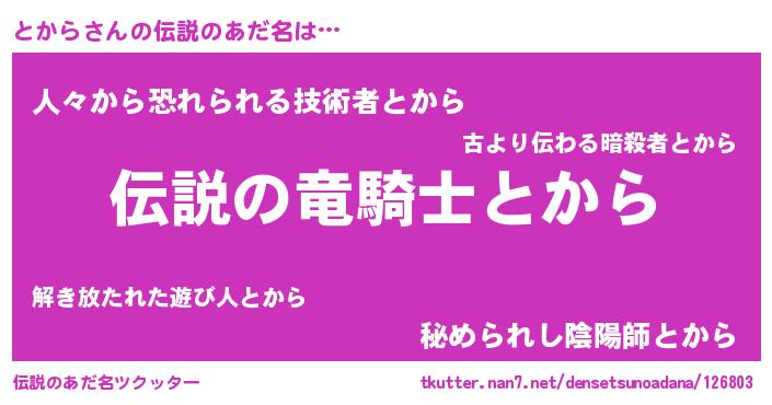 | 女子向けラノベタイトル風あだ名 | 『とからが死なない童話 林檎のとからの診療簿』 |