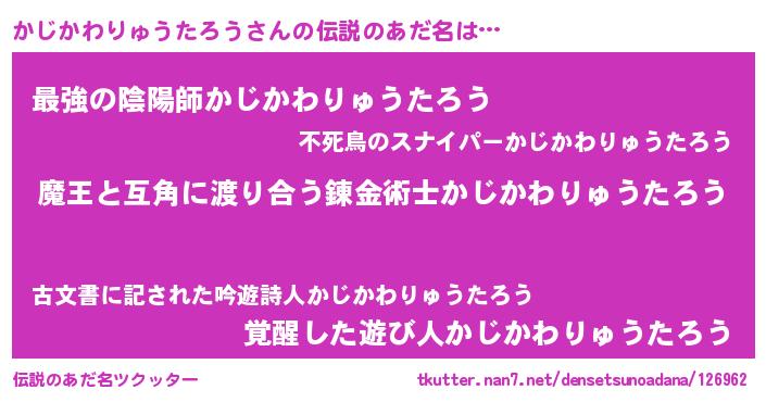 | 男性向けラノベタイトル風あだ名 | 『かじかわりゅうたろうに滅ぼされるだけの簡単なお仕事です』 |
