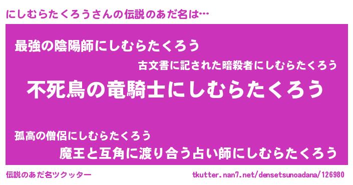 | 女子向けラノベタイトル風あだ名 | 『闇のにしむらたくろう』 |