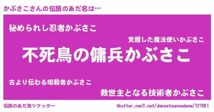 | 男性向けラノベタイトル風あだ名 | 『魔弾の王とかぶさこ』 |