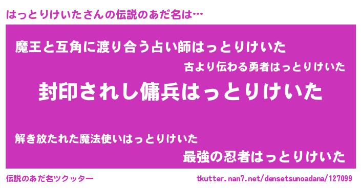 | 女子向けラノベタイトル風あだ名 | 『悪役はっとりけいたに転生したようですが、知った事ではありません』 |
