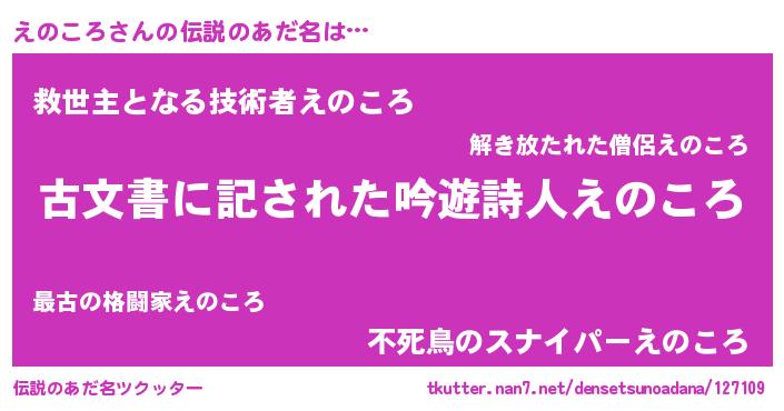 | 意味不明あだ名 | 『自称えのころ』『永久保存えのころ』 |