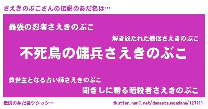 | ヒーロー風カッコイイあだ名 | 『スーパーサエキノブコ』『魔戒騎士サエ』 |