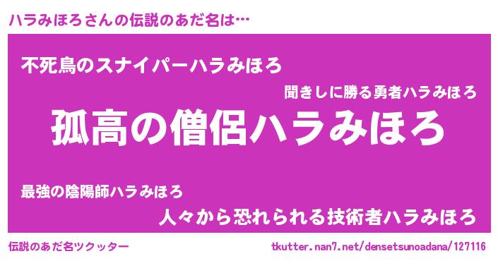 | ヒーロー風カッコイイあだ名 | 『暗黒騎士ハラ』『スーパーハラミホロ』 |