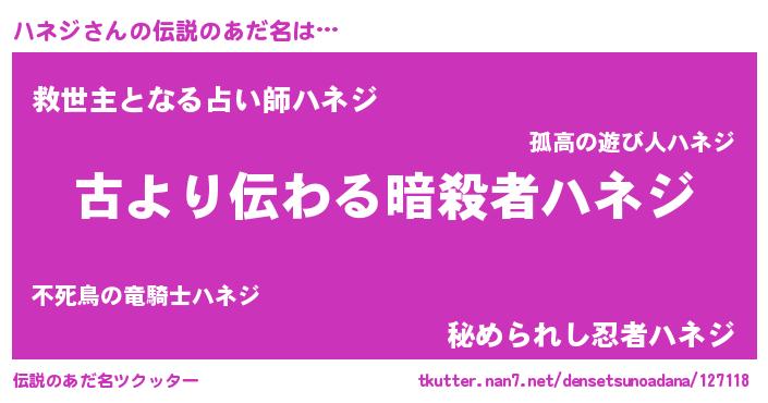 | 男性向けラノベタイトル風あだ名 | 『ハネジという概念が存在しない退屈な世界 』 |