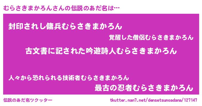 | 男性向けラノベタイトル風あだ名 | 『むらさきまかろん~年齢イコール彼女いない歴の魔法使い~』 |
