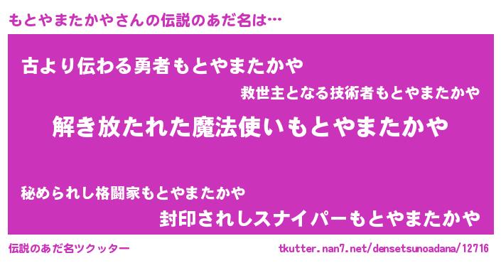 | 男性向けラノベタイトル風あだ名 | 『もとやまたかやの嫁は女の子じゃないと思った?』 |