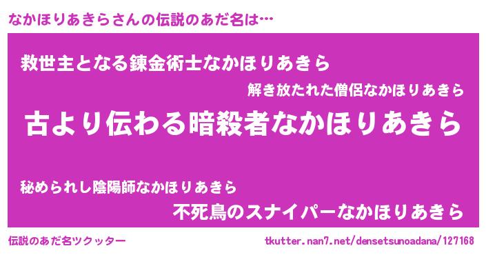 | ヒーロー風カッコイイあだ名 | 『ネオナカホリアキラ』『魔戒騎士ナカ』 |