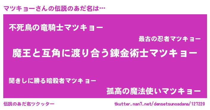 | 男性向けラノベタイトル風あだ名 | 『この素晴らしい世界にマツキョーを!』 |