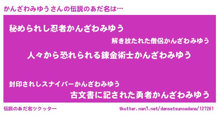 | 男性向けラノベタイトル風あだ名 | 『おまえをオタクにしてやるから、俺をかんざわみゆうにしてくれ! 』 |