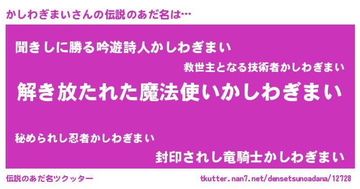 | 男性向けラノベタイトル風あだ名 | 『魔弾の王とかしわぎまい』 |
