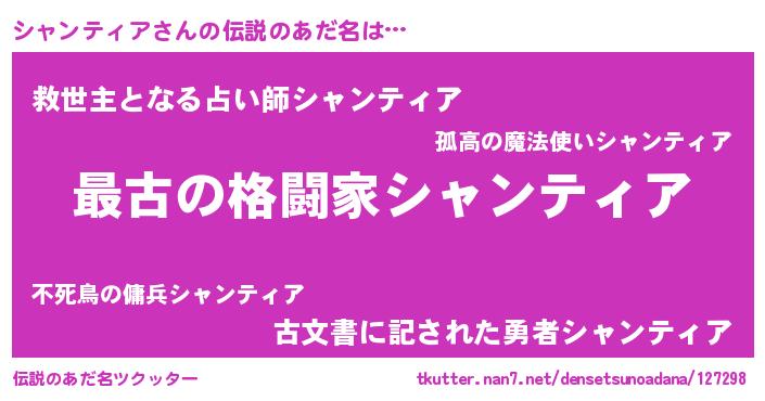 | 男性向けラノベタイトル風あだ名 | 『シャンティアに滅ぼされるだけの簡単なお仕事です』 |