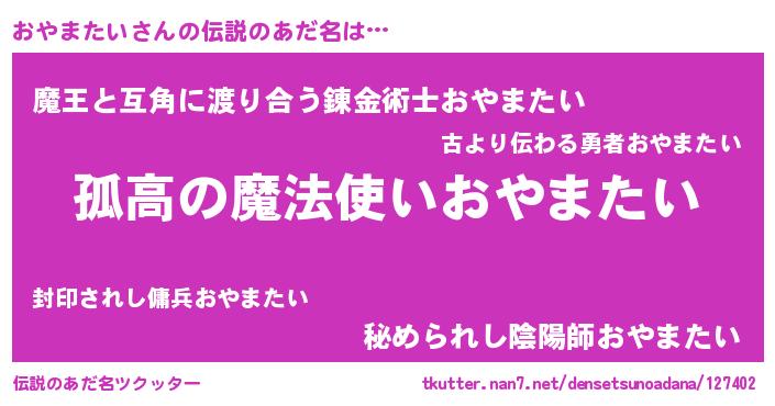 | ヒーロー風カッコイイあだ名 | 『暗黒騎士オヤ』『慈愛の使者おやまたい』 |