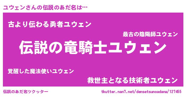 | 男性向けラノベタイトル風あだ名 | 『魔弾の王とユウェン』『ユウェンの憂鬱』 |