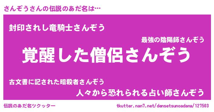 | 女子向けラノベタイトル風あだ名 | 『さんぞう様がみてる』『さんぞう恋絵巻』 |
