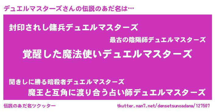 | 男性向けラノベタイトル風あだ名 | 『デュエルマスターズの嫁は女の子じゃないと思った?』 |